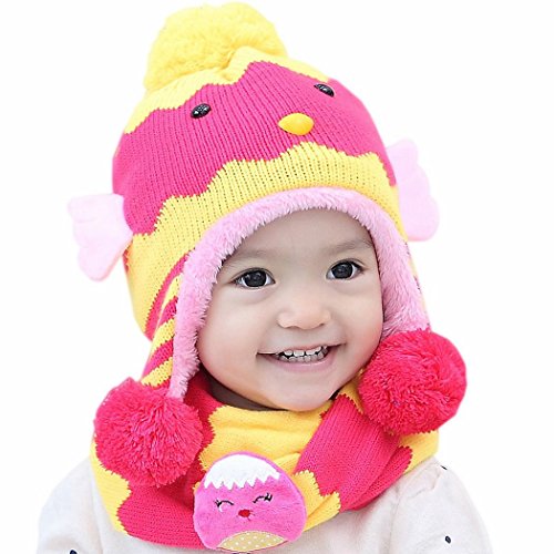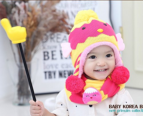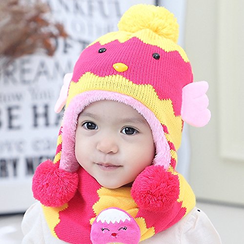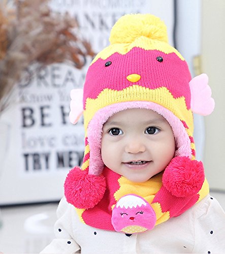 ニット帽子とマフラー 二点セット キッズ 鳥模様 ベビー 赤ちゃん 幼児 可愛い 厚手 起毛 偽装 記念撮影 帽子 ネックウォーマー (ローズ)