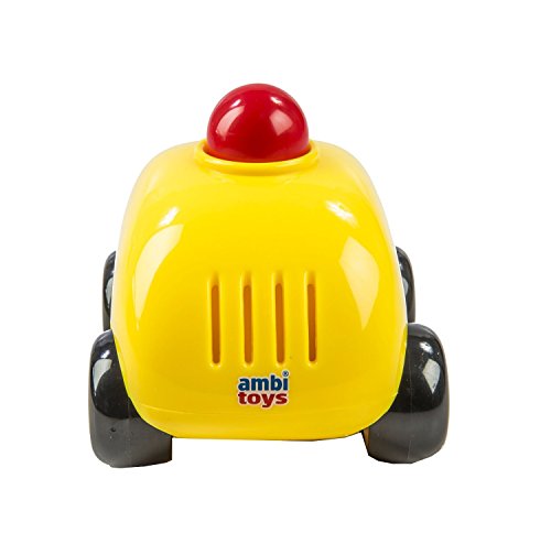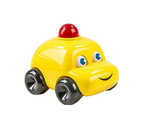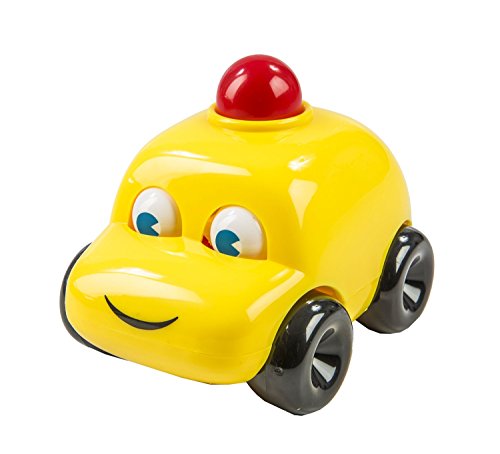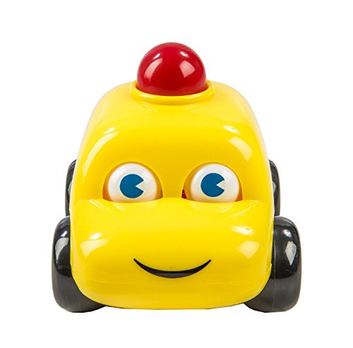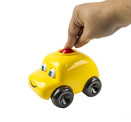 A cheerful yellow character to accompany a baby on that journey of imagination. His eyes move up and down as he rolls along, and the big red button activates his tooter. Encourages hand eye coordination.