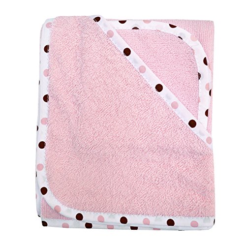 cotton terry;One hooded towel 30 X 30 and one washcloth 10 X 10;Trimmed with coordinating polka dot 100% percale cotton binding;Extra soft and super absorbent;Designed for baby's comfort