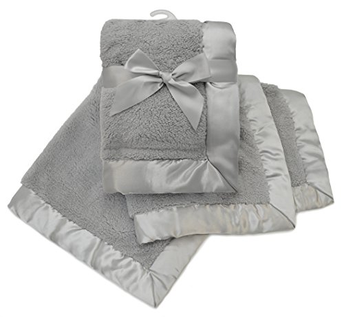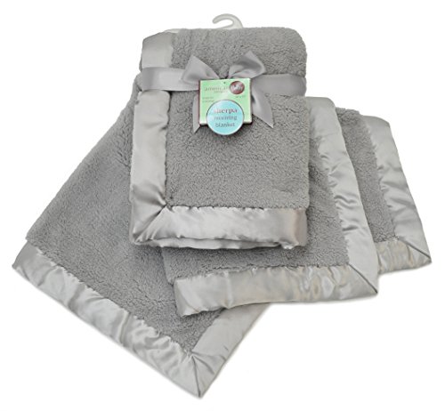 Front and back: 100% extra soft and cuddly polyester Sherpa with 2.5 in satin trim, Generously sized at 30 x 35 inches, Can be used in a baby carrier, stroller or as a traveling blanket; Perfect gift for baby shower, Machine wash in cold water and dry on lowest temperature setting, Imported