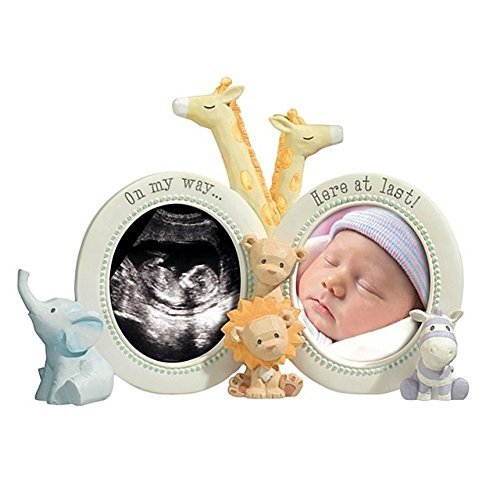 The Noah's Double Opening Photo Frame lets you proudly display your little one's beginning and arrival in 2 photo openings, Holds two 2.75" x 3" photos, Double round frame design features an adorable Noah's Ark theme with animals figures all around, One opening is for a sonogram picture and aptly titled, "On My Way" and the other opening, "Here At Last", is perfect for baby's arrival photo, Varied blend of colors makes it perfect for a boy or girl