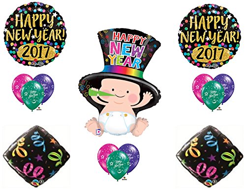 A 14-piece Happy New Year's Eve Party balloon Decorating kit. Wonderful balloons for your party You will receive: One (1) 31" XL Happy New Year's Baby wearing hat and diaper mylar shape balloon. Two (2) 17" Happy New Year 2017 round mylar balloons. Two (2) 18" Black with streamers square mylar balloons. Nine (9) 11" Happy New Year latex balloons..PLEASE NOTE***You will receive an assortment of colors, not just the three colors shown in the picture. They are jewel color balloons. An 11-piece New Year's Eve balloon decorating kit Perfect All balloons are new and shipped uninflated. Just add helium