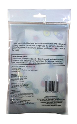 4 Multi Pack; Each pack includes 6 disposable baby bibs;Adhesive tabs provide a custom fit!;Built in Crumb Catcher Pocket; easy to Use! Hygienic!;Highly absorbent front layer with waterproof backing - perfect to take with you when out and about!;Save $ on this 4 pack