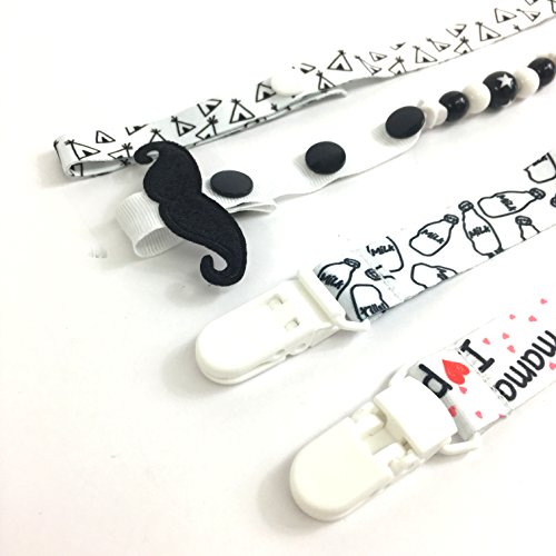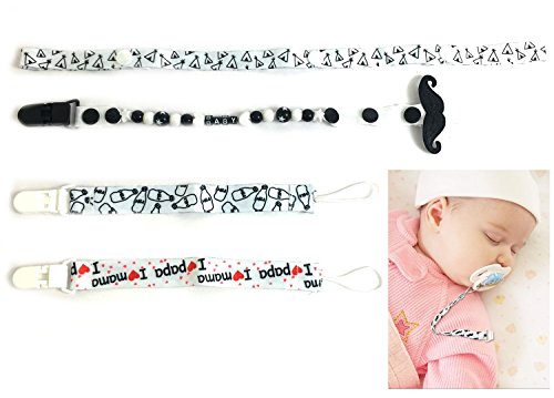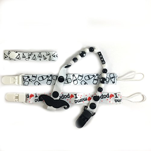 あれ?っと、おしゃぶりをうっかり置き忘れてしまったり紛失してしまったり・・・と困っていませんか?そんな悩みを解決♪ おしゃぶりホルダーを使用すれば、しっかり身につけることができ、おしゃぶりの落下防止や紛失防止になりとても便利です。 パチっと簡単に装着できる便利なクリップ式、しっかり装着できるのでお子さんが引っ張ってしまっても外れにくい安心デザイン。 ヒゲ付きホルダーと、お洒落な柄のリボンホルダーの2セット。洗って交互に使えたり、いつも清潔に使用できるので衛生面も◎ しっかりした作りのストラップ部分、ヒゲ付きホルダーは可愛いビーズとKISSの文字付きでとってもお洒落。 リボンホルダーは、シンプルでお洒落な柄の4種類(クロス柄/ヒゲ柄/ミルク柄/シェブロン柄 )から選べます。 可愛く安心して持ち歩け、うっかりおしゃぶりの紛失防止など忙しいママのサポートをしてくれる便利なホルダーです