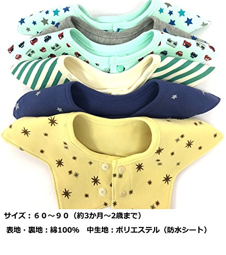 - 素材:表地:綿 内側生地:防水機能PVEA 肌に触れる表地は、優しい綿素材を使用。内側には薄い防水生地を挟み込んでいるので、お洋服に染みるのを防ぎます。また、よだれや飲みこぼしの浸透を防いでくれるので、よだれが多い時期の赤ちゃんも安心して身につけることができます。