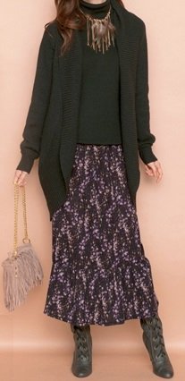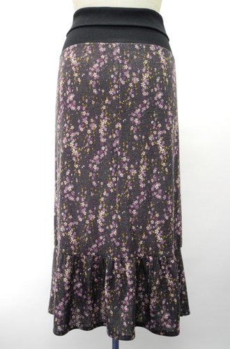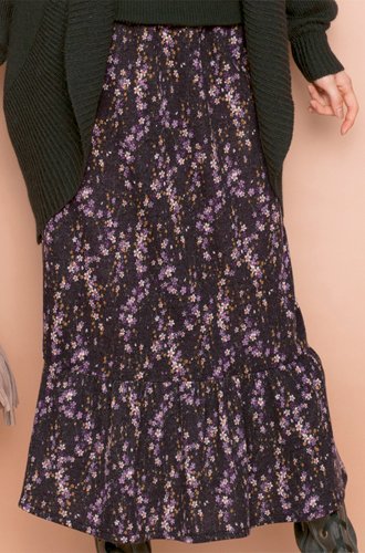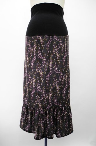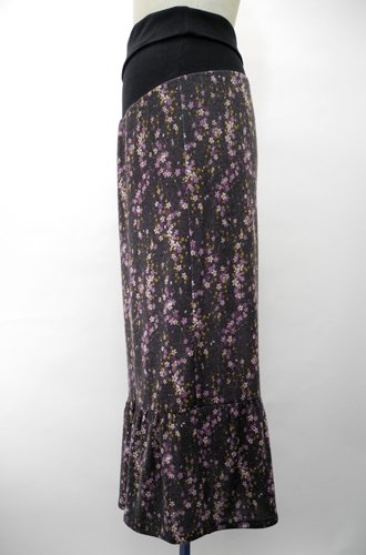 マタニティだってミディで最旬!臨月までトレンディガールをめざそ♪♬流行のマキシがムリでもプレママだってトレンディでなくちゃね!ロングスカートは、大きくなるお腹は伸縮性のあるリブニットで臨月までカバー、素材は起毛をかけたウォーム感のあるカットソーだから、楽で軽快なはき心地♥濃色ベースの小花の総柄×緩やかなAライン×動くたびに揺れる裾の幅広フリルが、全体をキュッと締めて、縦長のほっそり効果も満点♪ロマンティックなミディスカートで、高感度奈カジュアルコーデを満喫して♡