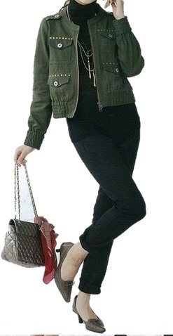- ●前=お腹部分にリブニット切り替え、飾りファスナー開き、左右切りポケット、ウエスト=フロントはボタンホール付ゴム入り調節可、左サイドファスナー開き、後=ウエストセンターに固定広幅ゴム、両サイドにゴムシャーリング、左右ダーツ、左右片玉縁ヒップポケット(ボタン留め)