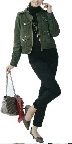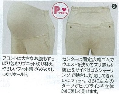 - ●前=お腹部分にリブニット切り替え、飾りファスナー開き、左右切りポケット、ウエスト=フロントはボタンホール付ゴム入り調節可、左サイドファスナー開き、後=ウエストセンターに固定広幅ゴム、両サイドにゴムシャーリング、左右ダーツ、左右片玉縁ヒップポケット(ボタン留め)