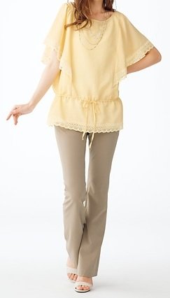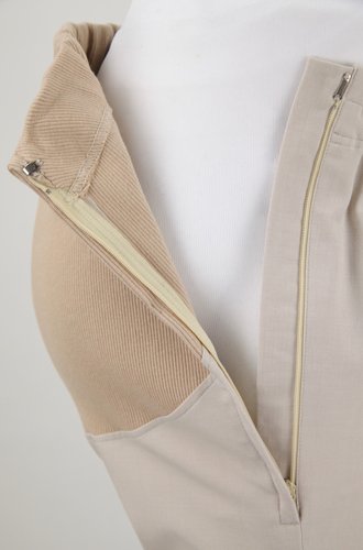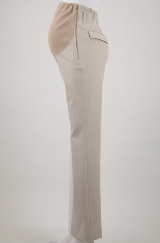 - ●前=お腹部分にリブニット切り替え、飾りファスナー開き、ウエスト=フロントはボタンホール付ゴム入り調節可、左サイドファスナー開き、後=ウエストセンターに固定広幅ゴム、両サイドにゴムシャーリング、左右ダーツ、左右片玉縁ヒップポケット