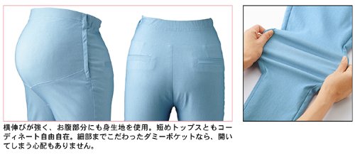 - ●サイズM:着丈53㎝、腹囲75~102㎝、ヒップ86~100㎝、わたり26㎝、裾幅13.5㎝