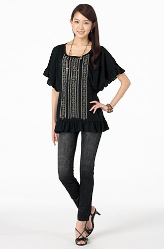 - ●素材/ストレッチニット天竺トロンプルイユデニム顔料プリント(ポリエステル85%、ポリウレタン15%)