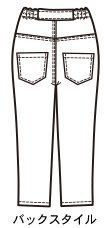 - ●前=お腹部分にリブニット切り替え、飾りファスナー開き、左右切りポケットリベット付、ウエスト=フロントはボタンホール付ゴム入り調節可、左サイドファスナー開き、後=ウエストセンターに固定広幅ゴム、両サイドにゴムシャーリング、V字切り替え、左右ヒップポケット