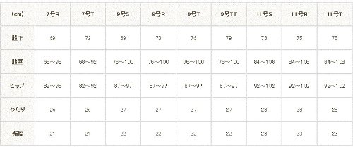 - ●サイズ9号T:股下76㎝、腹囲76~100㎝、ヒップ87~97㎝、わたり27㎝、裾幅22㎝