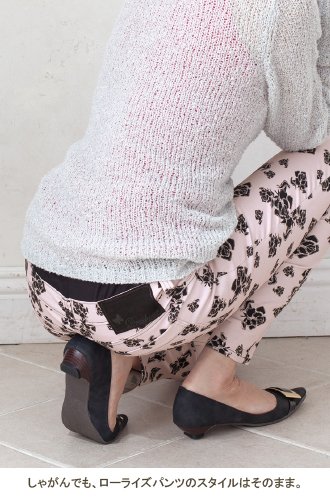 - 光沢感のあるストレッチチノにトレンドのバラ柄をプリント。
