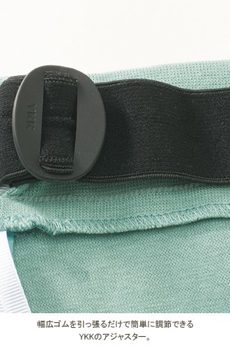 - 幅広ゴムを引っ張るだけで簡単に調節できるYKKのアジャスター。