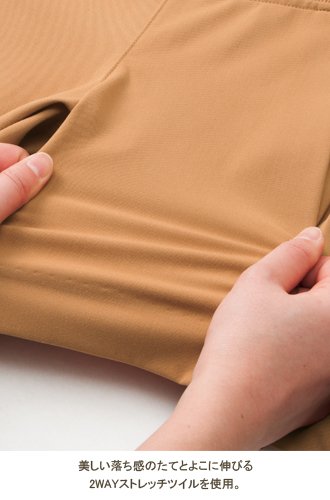 サイドプリーツで縦のラインを強調させてスタイル美人に。たて、よこにストレッチする素材ではき心地の良さも魅力。