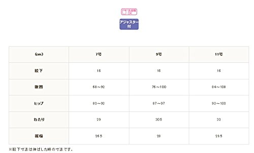 - ●サイズ7号:股下16㎝、腹囲68~92㎝、ヒップ82~92㎝、わたり29㎝、裾幅26.5㎝