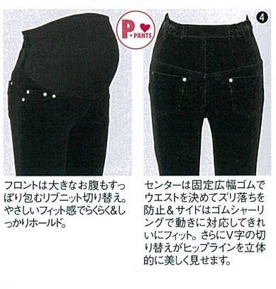 - ●前=お腹部分にリブニット切り替え、飾りファスナー開き、左右切りポケット&右コインポケットリベット付、ウエスト=フロントはボタンホール付ゴム入り調節可、左サイドファスナー開き、後=ウエストセンターに固定広幅ゴム、両サイドにゴムシャーリング、V字切り替え、左右ヒップポケットリベット付
