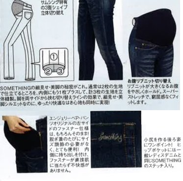 - ●前=お腹部分にリブニット切り替え、左右切りポケット&右コインポケット、ウエスト=ボタンホール付ゴム入り調節可、左サイドファスナー開き、後=立体切り替え、左右ヒップポケット、共布別と通し付、SOMETHINGロゴステッチ