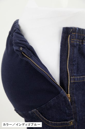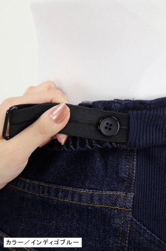 - ●前=お腹部分にリブニット切り替え、飾りファスナー開き、左右切りポケットリベット付&右コインポケット、ウエスト=フロントはボタンホール付ゴム入り調節可、左サイドファスナー開き、後=ウエストセンターに固定広幅ゴム、両サイドにゴムシャーリング、V字切り替え、左右ヒップポケット、前後にシェービング&前にひげ(ユーズドインディゴブルーのみ)