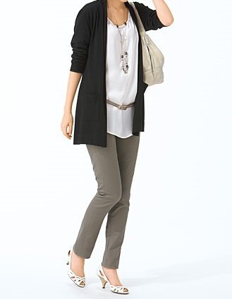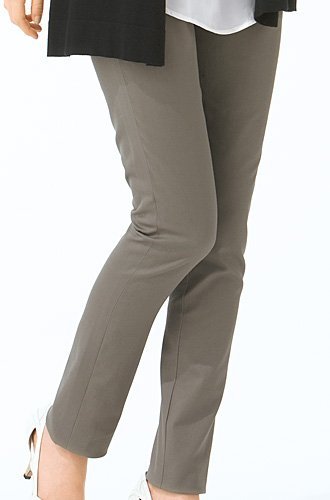 - ●前=お腹部分にリブニット切り替え 飾りファスナー開き ウエスト=フロントはボタンホール付ゴム入り調節可 左サイドファスナー開き 後=ウエストセンターに固定広幅ゴム、両サイドにゴムシャーリング 左右にダーツ 左右片玉縁ヒップポケット