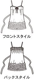 - ●胸元共布カットオフ仕立て、バスト切り替え下2タック入り、ウエスト=共布リボンベルト付調節可、裾4段ティアード共布フリルカットオフ仕立て、ストラップリボン結び調節可、背面共布カットオフ仕立て、後4段ゴムシャーリング