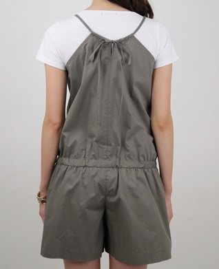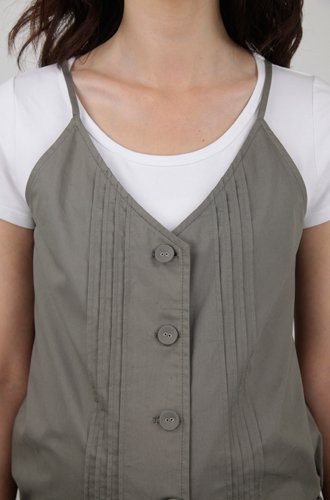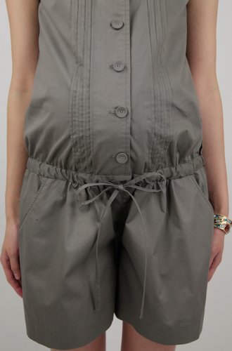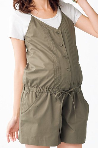 ピンタック&くるみボタンがポイントのシンプルなコンビネゾンは、大きなお腹を可愛く見せるうえ、インナー次第でテイストアレンジが自在!