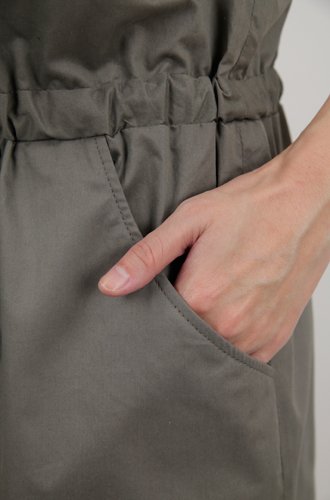 - ●前=共布くるみボタン半開 胸元ピンタック ローウエスト=切り替えに通し共布リボンベルト&ボタンホール付ゴム入り調節可 左右スラッシュポケット ストラップは後で結んで調節可
