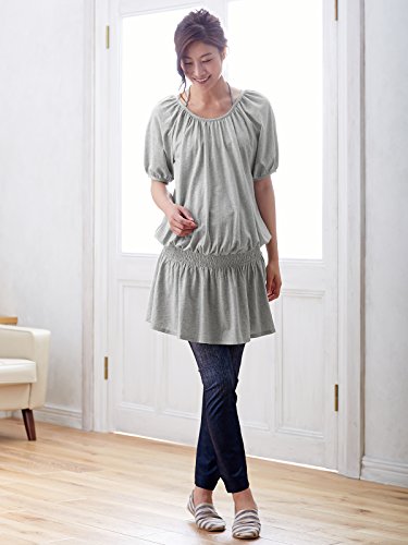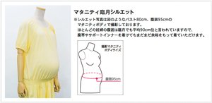 三つ編みリボンが、ホルタ―キャミをレイヤードしているようなかわいらしい表情を作ります。 胸元とローウエストのゴムシャーリングに繊細な細かいギャザーがたっぷり入っているので、大きくなったお腹もきれいにカバーします。