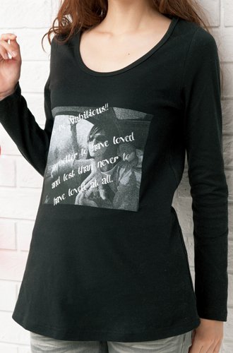 とろみのあるカットソーは、肌馴染みがよくてソフトでしなやか♪程よい厚みでストレッチが効いているから、妊娠初期から臨月、産後だって着られちゃう?フロントのプリントは、転写した写真に英文を乗せたラバープリントで、モノクロの陰影が超イカしてる☆スポンと着るだけ、コーデがビビッとキマリまくりッ!