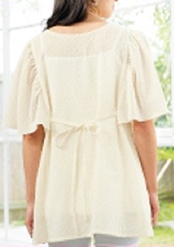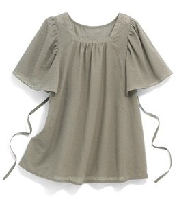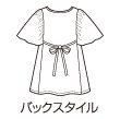 - ●前=衿ぐり共布切り替え、胸元ギャザー入り、両サイドパネル切り替え、バタフライスリーブ、後=ウエスト共布リボンベルト付調節可