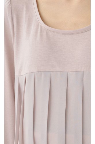 シフォンのきちんと感とカットソーの着心地のよさを併せ持つチャーミングなトップ。ぐるりと施されたプリーツラインは着こなすと、ふわりとボディラインをカバー。お腹をあまり目立たせたくないという人にもお勧めです。着丈は若干短めなのでスカートとのコーデにもぴったり。産後もずっと着られるデザインです。