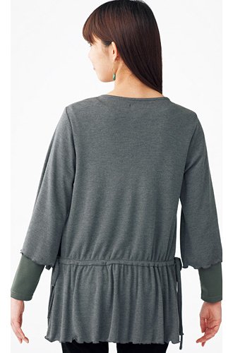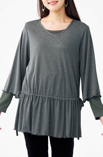 胸元のラインストーンが煌くチャーミングなトップは女性らしい柔らかなシルエットが素敵。お腹の大きさもカバーします。ローウエストで着丈調節できるので、パンツでもスカートでもコーデのバランスはばっちり。っカットソーのタートルをインにしてもすっきりと着られます。