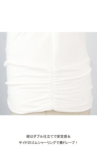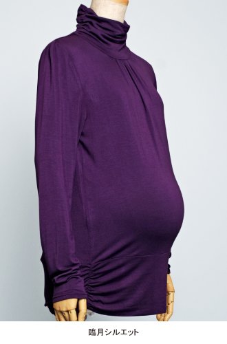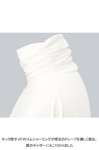 - ●ハイネック両サイド、裾切り替えダブル仕立ての両サイドにゴムシャーリング、胸元、肩口にギャザー入り