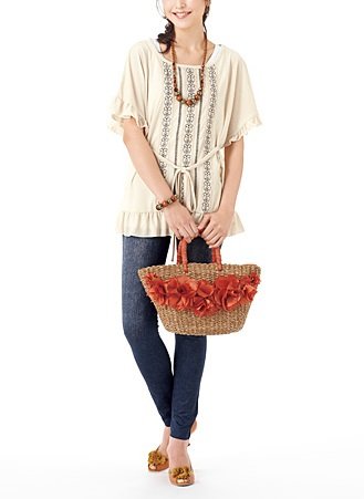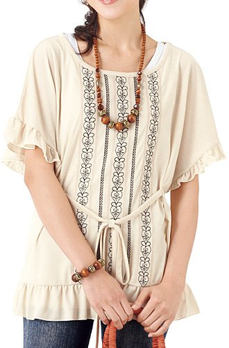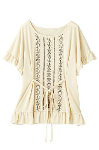 - ●前=ハンド風刺しゅう入り ウエスト=両サイドにタック、共布リボンベルト付前後どちらで結んでも調節可 袖口、裾にメロウフリル切り替え
