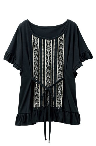- ●前=ハンド風刺しゅう入り ウエスト=両サイドにタック、共布リボンベルト付前後どちらで結んでも調節可 袖口、裾にメロウフリル切り替え