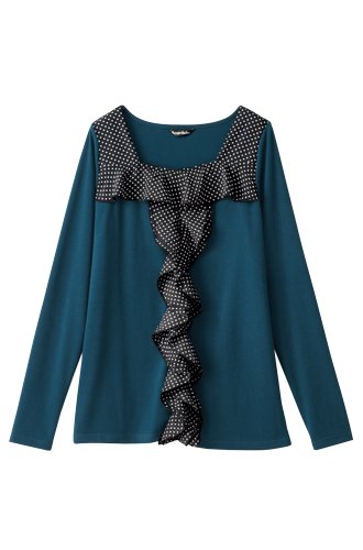 装いのアクセントになるフロントのフリルが縦のラインを強調し、ジャケットのインナーとしても大活躍。