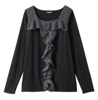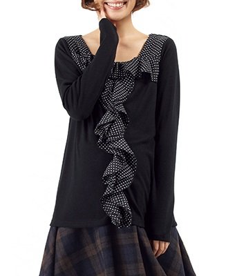 装いのアクセントになるフロントのフリルが縦のラインを強調し、ジャケットのインナーとしても大活躍。