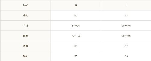- ●サイズL:着丈67㎝、バスト91~103㎝、腹囲78~108㎝、肩幅37㎝、袖丈60㎝