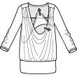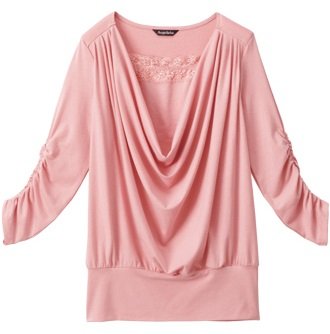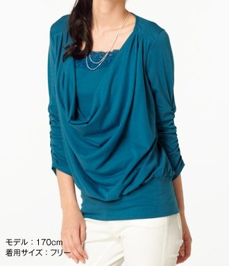 美しく弧を描くドレープや袖のシャーリングに視線集中、首まわりや腕をほっそり見せてくれます。