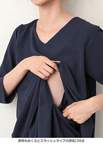 - ●【授乳しやすいバックシャンデザイン】身頃はシフォンの二重仕立て。裾に向かってフレアになる絶妙Aラインシルエットが、気になるウエストまわりをさりげなくカバーしてくれます。表地をめくるとスラッシュタイプの授乳口が付いています。