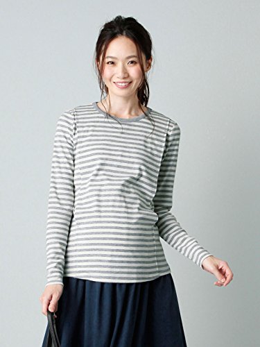 Angeliebe エンジェリーベ マタニティ 授乳口付き 綿混 やわらか フライス クルーネック Tシャツ 妊婦服 産前 産後 長袖 M ~ L グレー × オフボーダー 22070 22070602