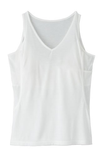 取外しのできるパッド付の便利なタンクトップです。デコルテラインを華奢に、美しく見せてくれるやや深めのVネックが特徴です。さらりとした、落ち感美しいカットソー素材を使用しているので、カーディガンやジャケットのインナーとして着回しの効くアイテムです。リラックスウェアとしてもおすすめ。ブラジャーやハーフトップをつけて着用する事も出来るので、TPOに合わせて楽しんで。