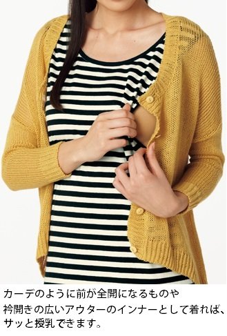 ウエストあたりまで大きく開いたアームホールを広げて胸を出し、授乳するスタイルです。