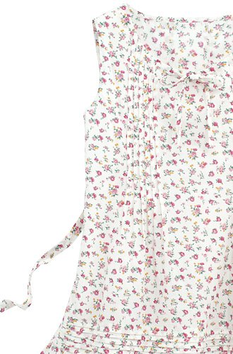 - ●前=胸元にピンタック、衿ぐりに通し共布リボン調節可 ウエスト=共布リボンベルト付(糸ループ付/取り外し可)調節可 後=衿ぐりにピンタック 裾ギャザー切り替え上にピンタック