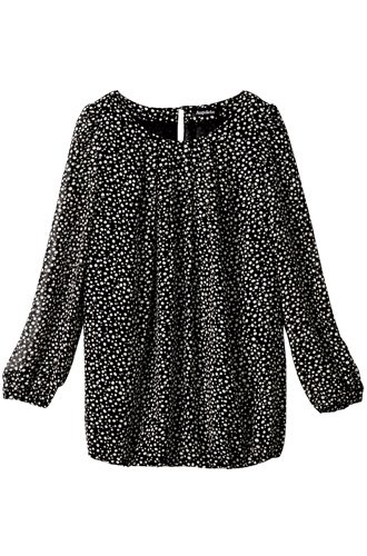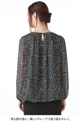 大人トップスの条件は、しなやか素材、美しいシルエット、ときめくデザイン。 スモーキーカラーにランダムなドット柄が落ち着いた印象。胸元からのドレープ、袖の軽い透け感が女性らしさを引き立てます!キュートなデザインも広がりを押さえたシルエットが大人っぽい。
