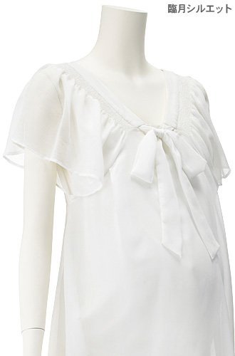- ●前=重ね身頃下の両サイドスリット開きの内側に授乳用スラッシュ開きあり、Vラインゴムシャーリング、共布ボウタイ付、バスト切り替え下にタック、背面タック切り替え