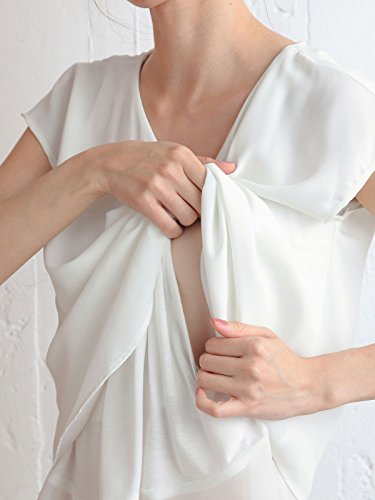 - ●【産前~産後まで使える授乳口付きVネックエステルジョーゼット×シフォントップス】ふわりと軽やかなエステルジョーゼットとシフォンの組み合わせ。小さめのスリーブやすっきりとしたVネックでキレイめな印象に。表地をめくるとインナーにスラッシュタイプの授乳口があります。