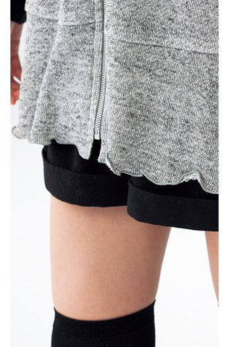 - ●前=ファスナー全開 フードにハトメ&通しスピンドルひも カンガルーポケット 袖切り替えタック入り 袖口・裾はメロウフレア