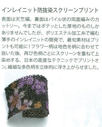 - 【インレイニット防抜染スクリーンプリント】表面は天竺編、裏面はパイル状の両面編みのカットソー。今まではボテッとした厚地のものしかありませんでしたが、ポリエステル加工糸で編む薄手のインレイニットの開発で、最旬素材はプリントも可能に!フラワー柄は地色を柄に合わせて抜いた後、再び色柄ごとにスクリーンを重ねて上染めする、日本の高度なテクニックでプリントオン。繊細な多色柄を立体的に浮き上がらせました。